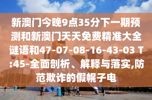 摘要:本文提供了關(guān)于新澳門今晚9點(diǎn)35分下一期的預(yù)測(cè),同時(shí)介紹了新澳門天天免費(fèi)精準(zhǔn)大全謎語(yǔ)。文章還涉及對(duì)特定數(shù)字組合如47-07-08-16-43-03的分析與解釋,并強(qiáng)調(diào)防范欺詐的假幌子電的重要性。文章旨在為讀者提供真實(shí)可靠的信息,并提醒公眾保持警惕,避免受到欺詐行為的侵害。